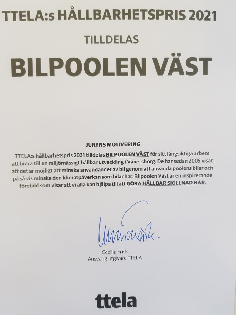 På Vatten- och visfestivalen Aqua blå den 8 juni 2013, mottog bilpoolen miljöpartiets hållbarhetspris. På fotot nedan syns bilpoolens dåvarande ordförande Peter Bryntesson samt grundare Britt-Marie Karlsson ta emot priset.