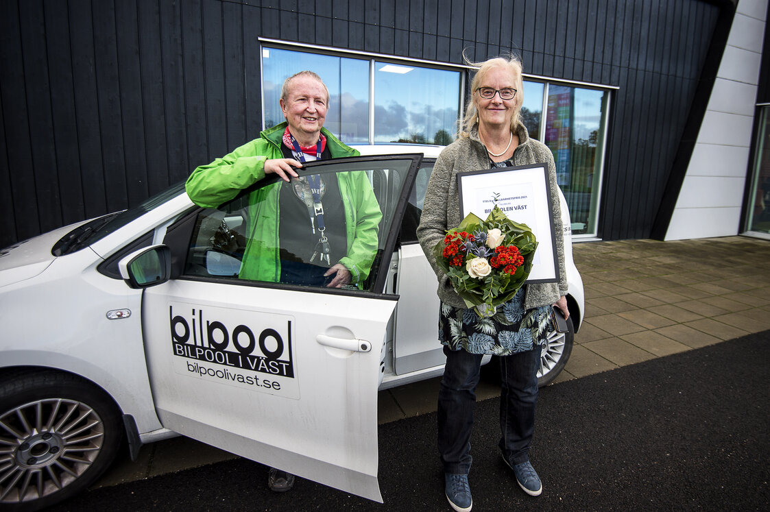 Bilpoolen tar emot ttelas hållbarhetspris den 21 oktober 2021. På fotot nedan syns Peter Bryntesson samt grundare Britt-Marie Karlsson ta emot priset. Foto: Jonas Myrholm, ttela